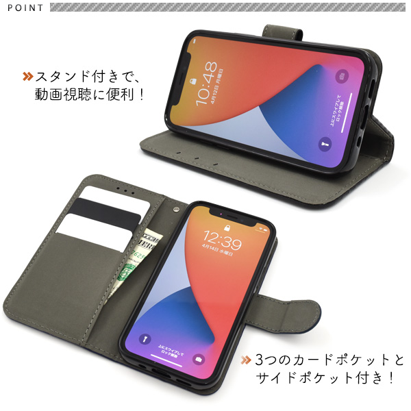 衝撃やキズなどからiPhone 12 miniを守ります。 また、内部はソフトケースなので着脱が簡単です。 背面を折り返すとスタンドとして使用できるので、動画視聴に便利! 落下防止に便利なストラップホール&ストラップ付きです。 横開きタイプなので、手帳のように使うことができます。 また、内側に3つのカードポケットとサイドポケット付き! | ||||||||||||||