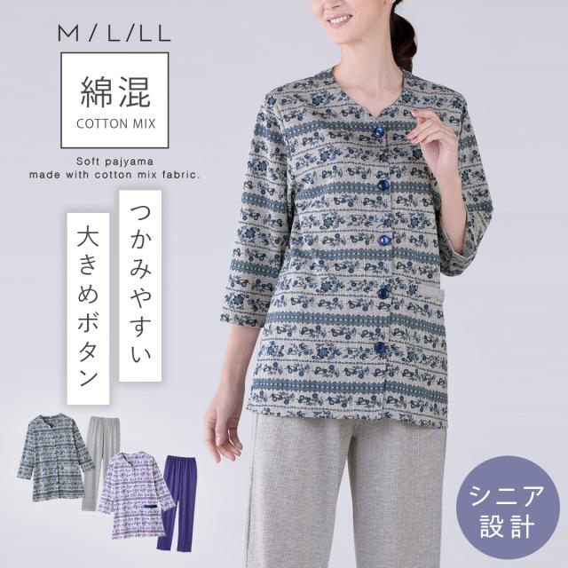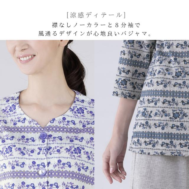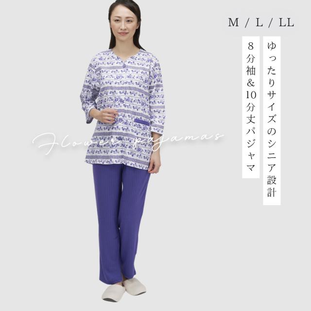 パジャマ レディース 夏,女性 シニア パジャマ,入院 パジャマ 前開き 大きいサイズ,パジャマ,ルームウェア,ホームウェア,部屋着,上下,8分袖,八分袖,衿なし,10分丈,十分丈,ズボン,パンツ,大きめボタン,春夏,春,夏,ポケット,ポケット付き,花柄,パープル,紫,グレー,前開き,前あき,薄手,薄い,ウエストゴム,ウエスト総ゴム,ウエスト,総ゴム,ゴム取り換え可能,大人,レディース,女性,お年寄り,高齢者,シニア,介護,入院,病院,50代,60代,70代,80代,ミセス,婦人,おしゃれ,お洒落,オシャレ,かわいい,可愛い,M,L,LL,大きいサイズ,ゆったり,大きめ,