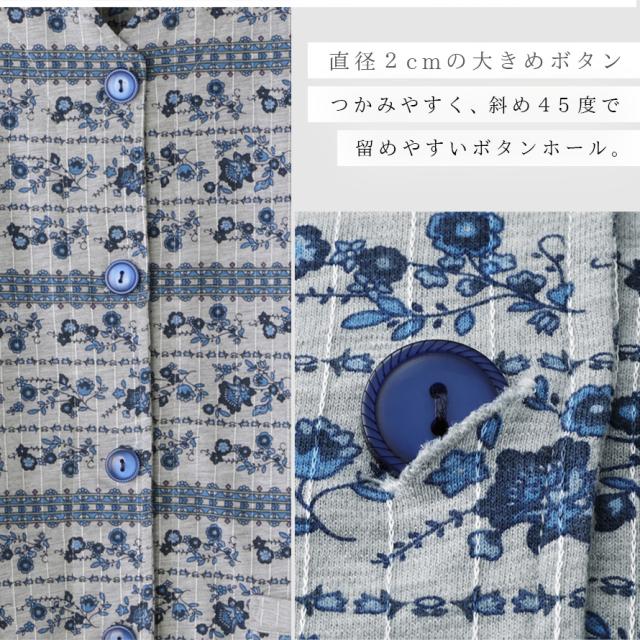 シニア向けに作られた設計の安心パジャマ。前開きボタンタイプで大きめボタンがつかみやすく、ボタンホールが斜めで留め外しがラクにできます。