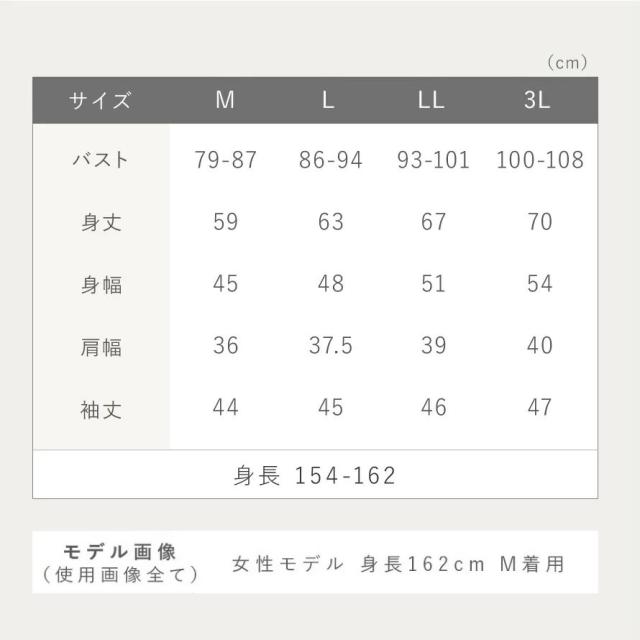 ■サイズ:身長154-162、M/バスト79-87、身丈59、身幅45、肩幅36、袖丈44、L/バスト86-94、身丈63、身幅48、肩幅37.5、袖丈45、LL/バスト93-101、身丈67、身幅51、肩幅39、袖丈46、3L/バスト100-108、身丈70、身幅54、肩幅40、袖丈47cm。モデル/身長162cm、Mサイズ着用。