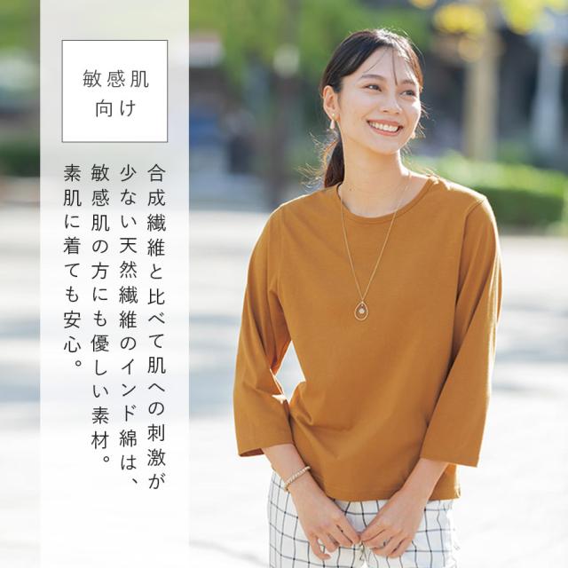 綿100%で肌に優しいレディー ス七分袖Tシャツです。原料のオーガニック綿から製品まですべてインド国内で生産されています。