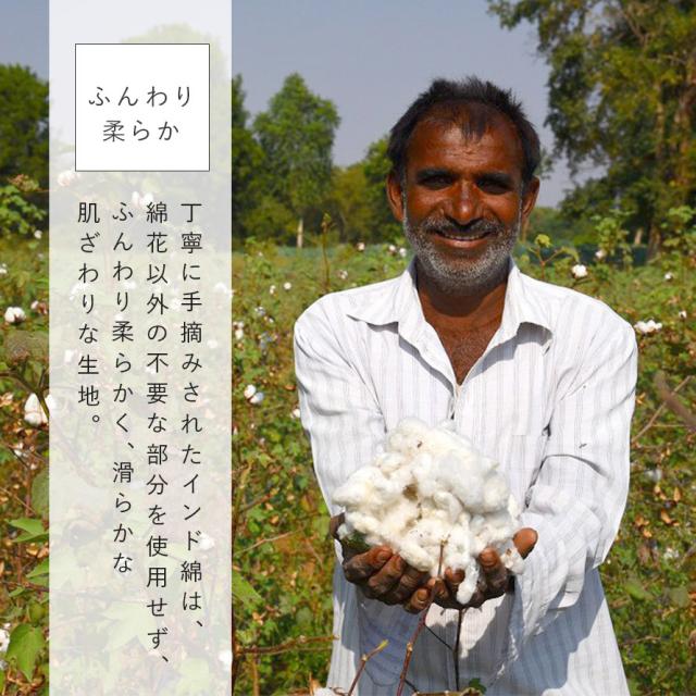 やわらかな肌触りは、綿花を手摘みでおこなうインド綿ならではの特徴です。着心地を気に入っていただき、リピーターの方が多い商品です。オーガニック素材なので、敏感肌の方にもおすすめです。