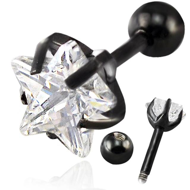 立爪で星型のクリスタルのキュービックジルコニアを固定した黒色メッキしたストレートバーベル型のボディピアス。