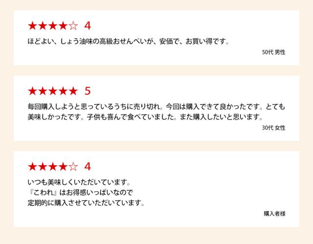 - もち吉の商品はどれを食べても美味しいです。今回初めて割れせんを購入しました。個包装よりもお値打ちで、もう一枚と手が止まりません家族も喜んで食べています。ぜひまたリピします。