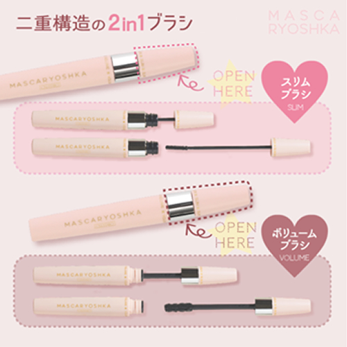 ★メール便送料無料☆新形状!二重構造の2in1ブラシ【カリプソ マスカリョーシカ】目頭から目尻までしっかりキャッチ!2本のブラシで仕上げるロング&カールマスカラ/ボリュームブラシの中からスリムブラシが出てくる!materi29P2