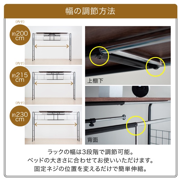 木製 幅200 幅215 幅230 後付 3段階 ベッド回り収納 伸縮ラック サイズ調整 シンプル 寝室 スチール メッシュ 巣ごもりベッド ぐうたらベッド ディスプレイ ステーションベッド ベッドアクセサリー システムベッド 一人暮らし 子供 男前 便利 クローゼットハンガーラック エクステンション ストッパー付き システム シングル セミダブル ダブル