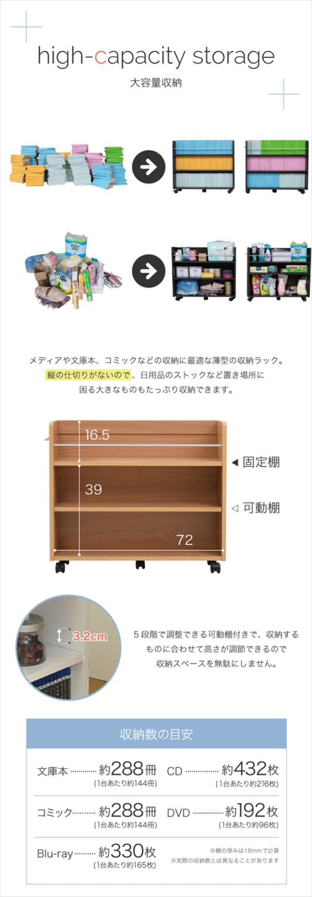 | 【収納数(1個あたり)】 [文庫本]約144冊 [コミック]約144冊 [CD]約216枚 [DVD]約96枚 [Blu-ray]約165枚 |