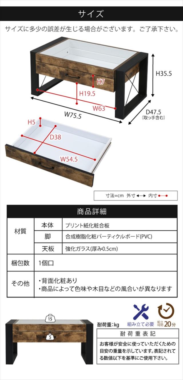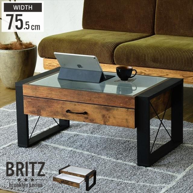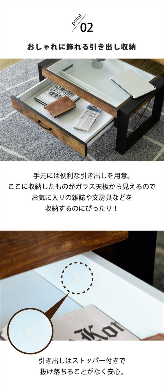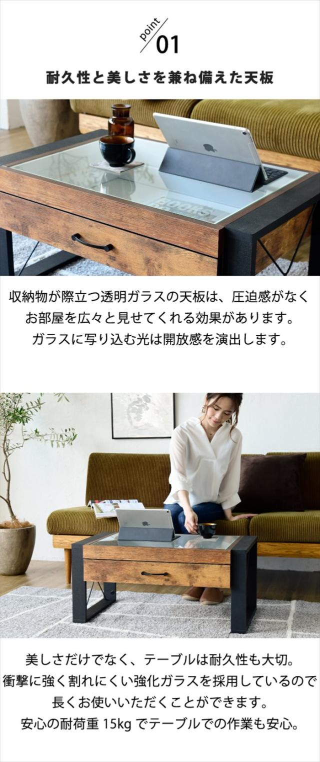ローテーブル 収納 センターテーブル ガラス リビングテーブル ブルックリン 長方形 引き出し 収納付き 強化ガラス 一人暮らし テレワーク 在宅 コンパクト