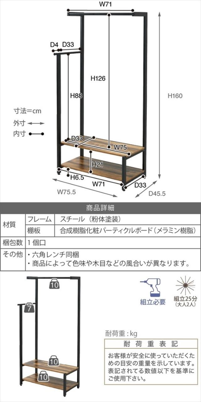 | [内寸] (ハンガー大)約幅71×高さ126cm (ハンガー小)奥行33×高さ88cm (フック)出幅4cm (棚間)約幅71×奥行33×高さ21cm (脚間)約幅71×奥行33×高さ6.5cm |