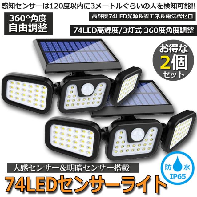 センサーライト ソーラー式 74LED 2個セット 3灯式 360°角度調整可能 ソーラーライト 屋外 ソーラーライト 高輝度 IP65防水 自動点灯消灯 光&人感センサー 大容量バッテリー 壁掛け 玄関 駐車場 車道 歩道 芝生 庭 地震 台風 停電 災害時に適用