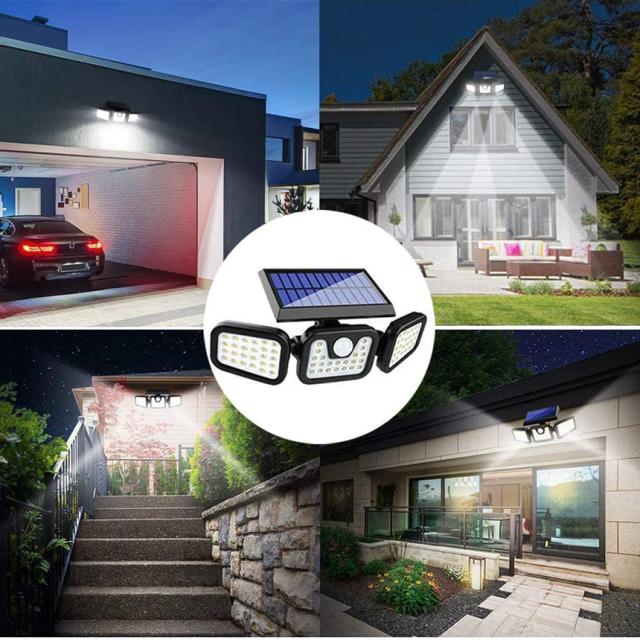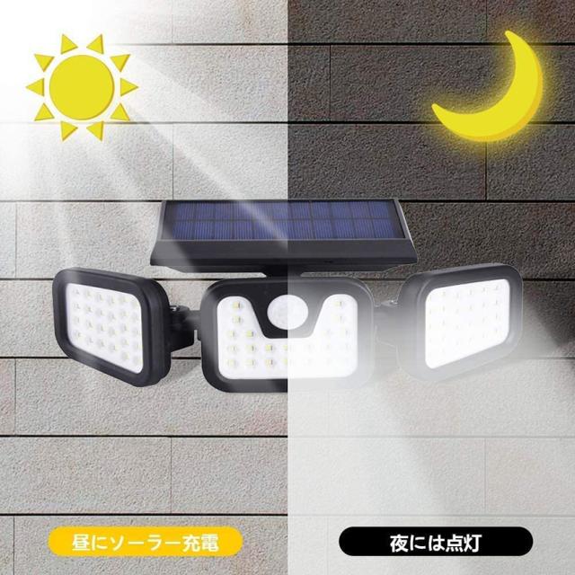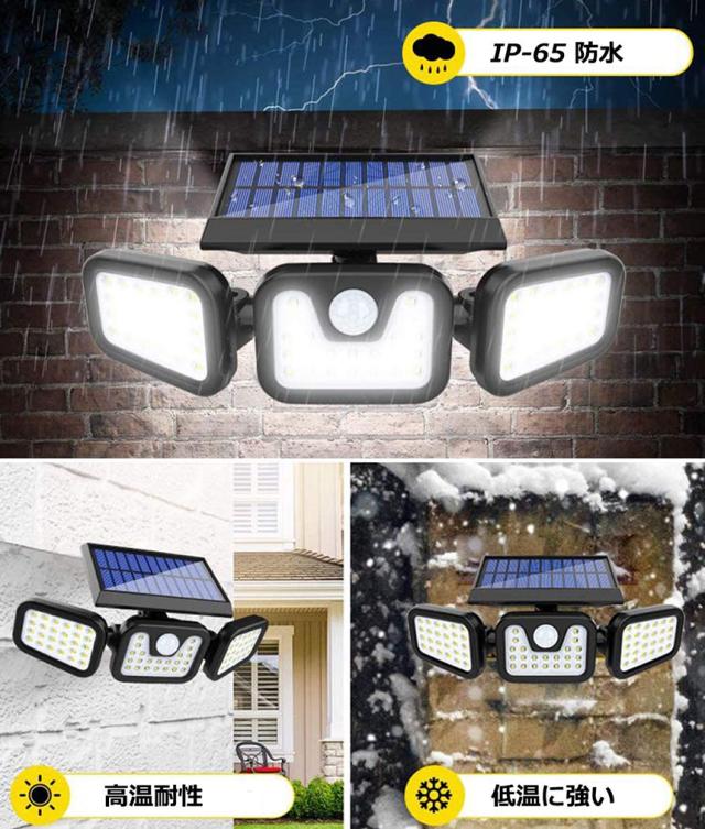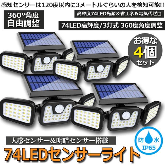 センサーライト ソーラー式 74LED 4個セット 3灯式 360°角度調整可能 ソーラーライト 屋外 ソーラーライト 高輝度 IP65防水 自動点灯消灯 光&人感センサー 大容量バッテリー 壁掛け 玄関 駐車場 車道 歩道 芝生 庭 地震 台風 停電 災害時に適用