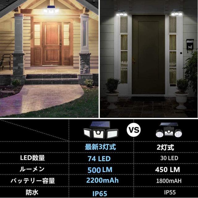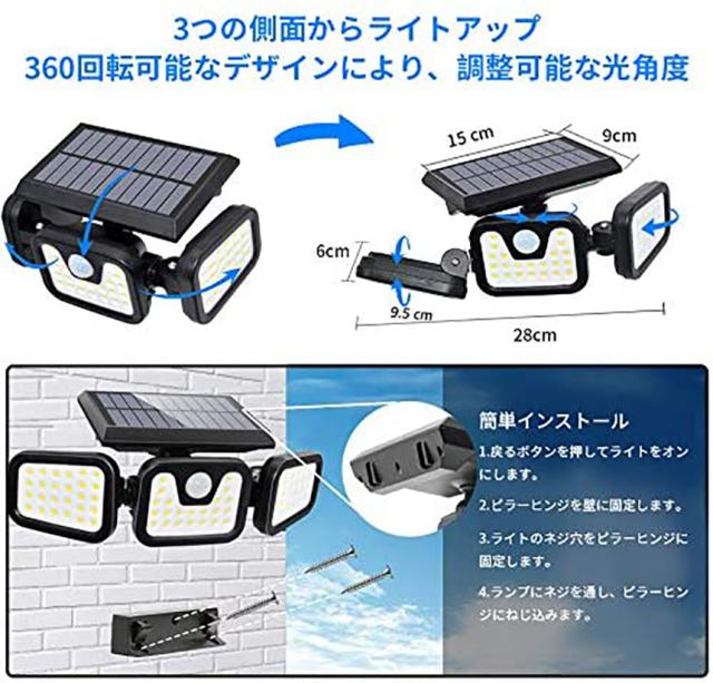 【お得な【4個セット】になります。】【最新3灯式--高輝度74LED光源&360°角度調整可能】高輝度の74LEDを搭載したセンサーライトで、明るさは500ルーメンにも達します。ソーラーパネルの部分は360°の角度に調節できますので、太陽の良く当たる方へ向けられ、十分にソーラー充電できます。それに、最新式-3灯を採用して、両側のライトは左右120°調整、上下360°回転することができますから、お好きな照射方向によって自由自在に変えられます。照射範囲は最大270°になれます!夜の防犯灯としてすごく実用です。