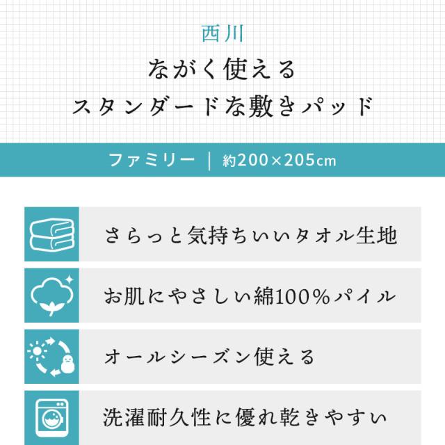 西川 敷きパッド ※2枚組※ ファミリーサイズ 200×205cm 綿100% パイル タオル地 西川 夏 夏用 敷パッド パッド パット ベッドパッド