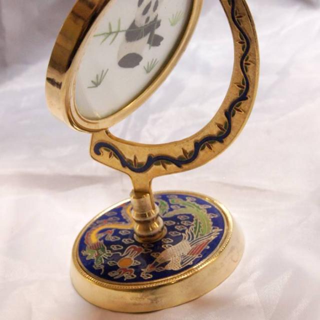 シルク色で刺繍されたパンが描かれている、七宝製の台のついた飾りです。