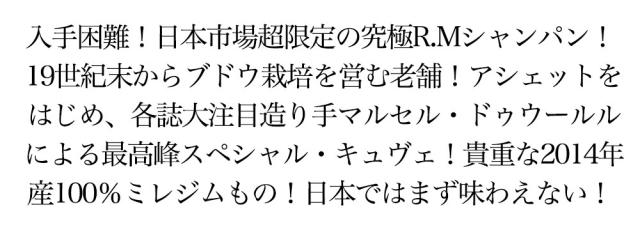 入手困難!日本市場超限定の究極R.Mシャンパン!19世紀末からブドウ栽培を営む老舗!アシェットを はじめ、各誌大注目造り手マルセル・ドゥウールル による最高峰スペシャル・キュヴェ!貴重な2014年産100%ミレジムもの!日本ではまず味わえない!■さまざまなギフトアイテムをご用意しております。お中元 ギフト 御中元 お盆 お礼 敬老の日 クリスマス 冬ギフト お歳暮 御歳暮 お年賀 御年賀 お正月 年末年始 ご挨拶 バレンタイン ホワイトデー お返し 父の日 母の日 ギフト 贈答品 お土産 手土産 御祝 御礼 内祝い 引き出物 お祝い 結婚祝い 結婚内祝い 出産祝い 出産内祝い 引き菓子 快気祝い 快気内祝い 進学祝い 誕生日祝い バースデーケーキ プレゼント Wedding ウェディング ホームパーティ お花見 パーティ 退職ギフト 退職 就任祝い