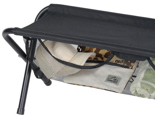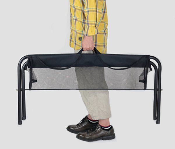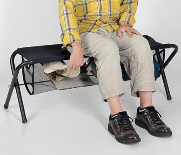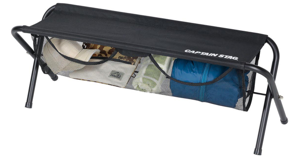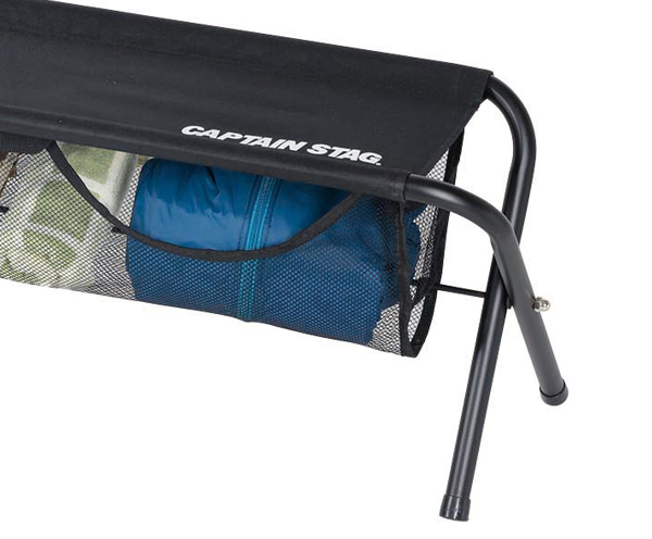 ●メッシュ素材の大型収納棚が付いたフォールディングベンチです。