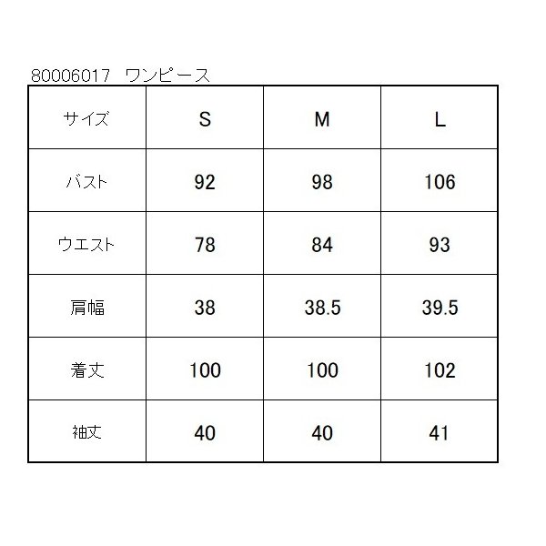 <S>バスト92、ウエスト78、ワンピース丈100、肩幅38、袖丈40
