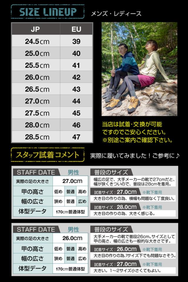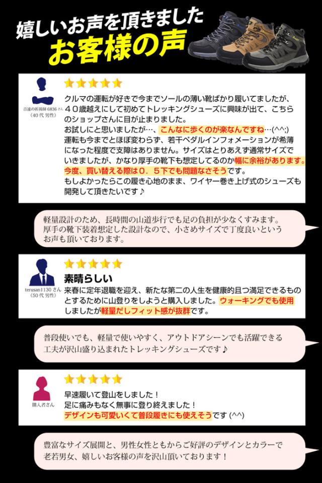 - 気軽に街中でも履けるトレッキングシューズを探して、こちらにたどり着きました。 アフターサービスもしっかりされており、対応も迅速で、日曜日に注文して2日後には手元に届き、とにかく安心できるショップさんです。 シューズの履き心地もよく、トレッキングシューズにしてはすごく軽い! 今回、一番小さいサイズをお願いしましたが、少し大きかったです。でも厚めの靴下が履けるので、冬場などはとくにグッドかも。 希望をいえば、今後もう一サイズ小さいサイズができると嬉しいです。 ありがとうございました。