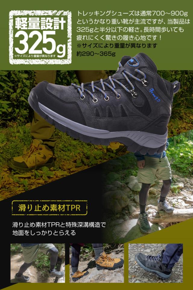 - 山登りを始めたい友達と一緒に初心者ハイキングに行く為に購入しました。本格的なトレッキングシューズより軽めで履きやすそうな感じがしたので選びましたが、とても履きやすく歩きやすかったです。サイズ感は少し大きめでしたが、厚手の靴下と中敷きでちょうどよかったです。