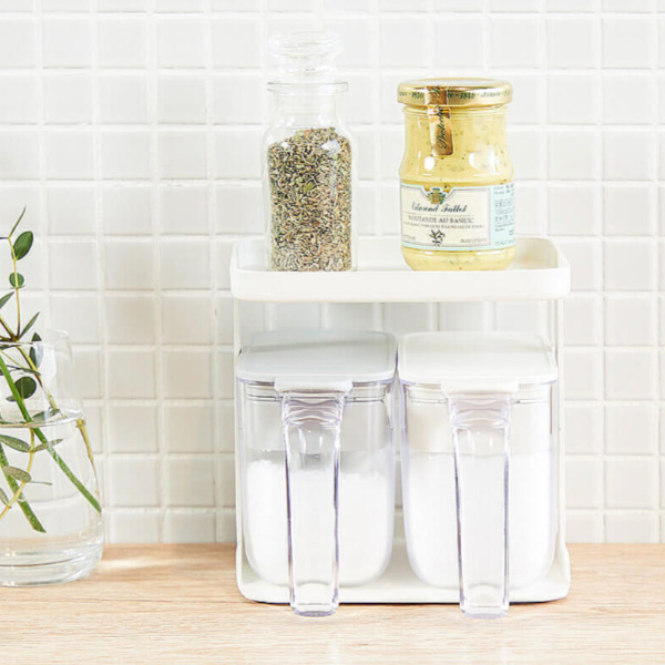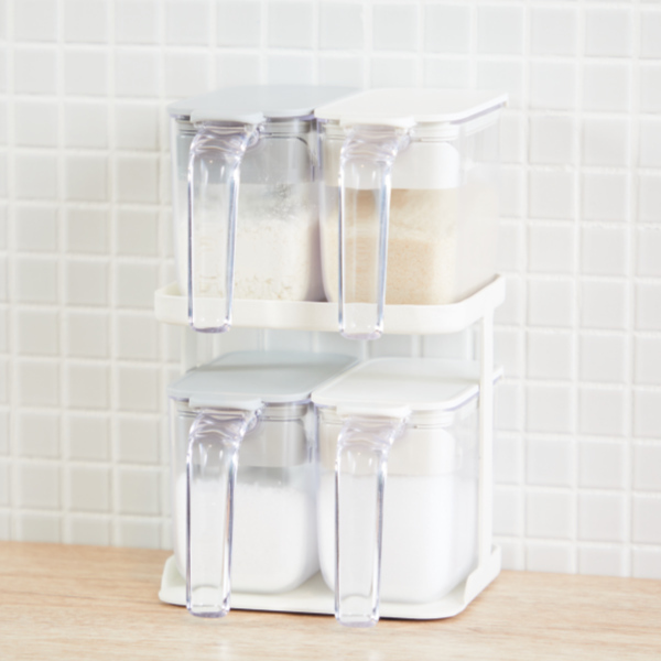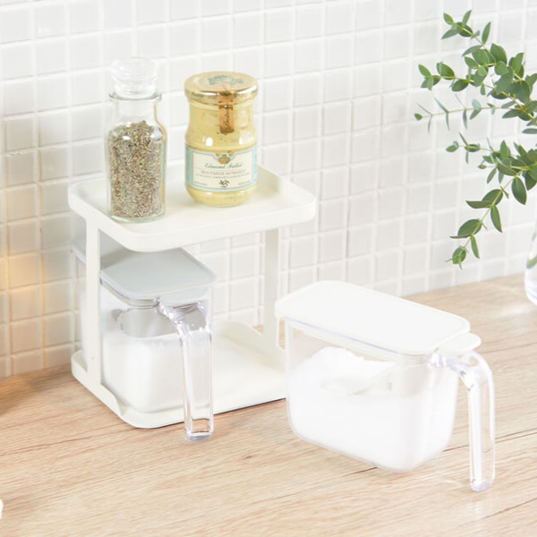 別売りの「グッドロックコンテナ 調味料ポット」が1段に2個、最大4個ぴったり収納できます。耐荷重約3kgなので、上段にはガラス瓶に入った調味料やスパイスボトルなども置くことが出来ます。