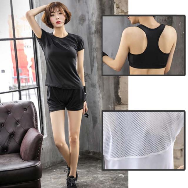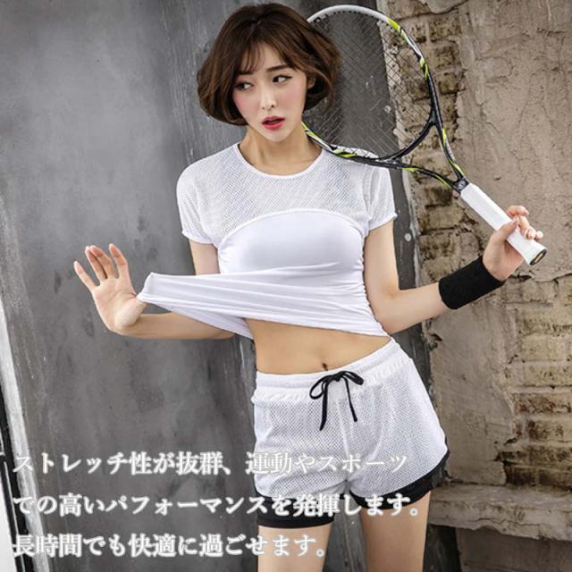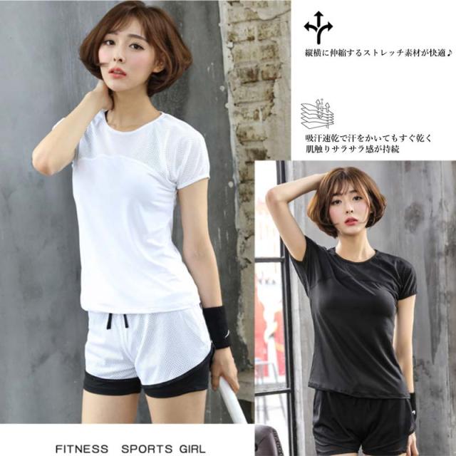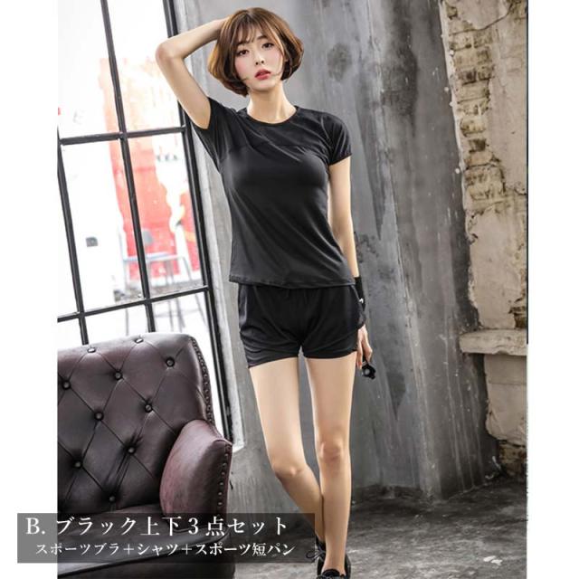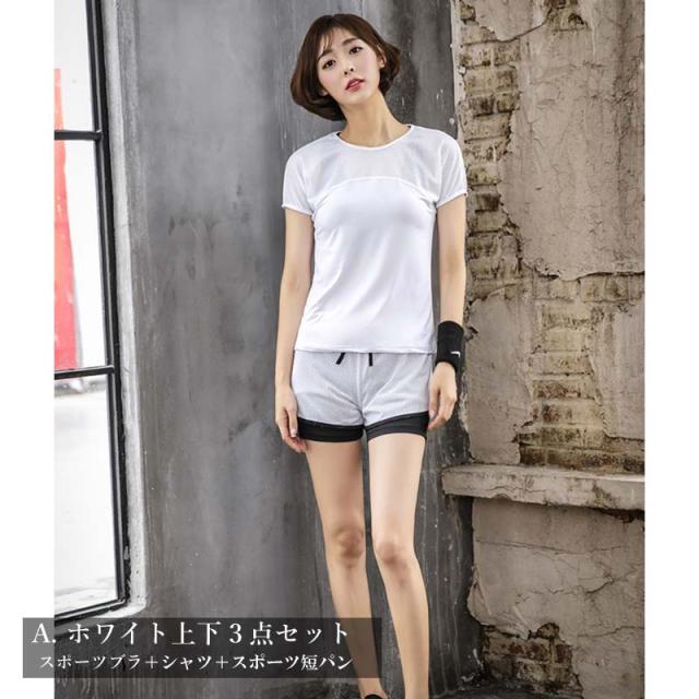 フィットネスウェア レディース ヨガウェア 上下セット スポーツブラ 3点セット 半袖トップス シャツ ヨガパンツ レギンス スポーツウェア ショートパンツ 短パン スポーツブラ 大きいサイズ ウォーキング ジョギング ジム 体操 エアロビクス 春夏秋 メール便送料無料
