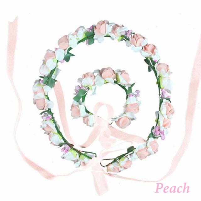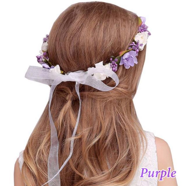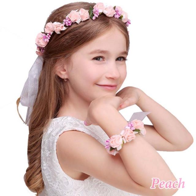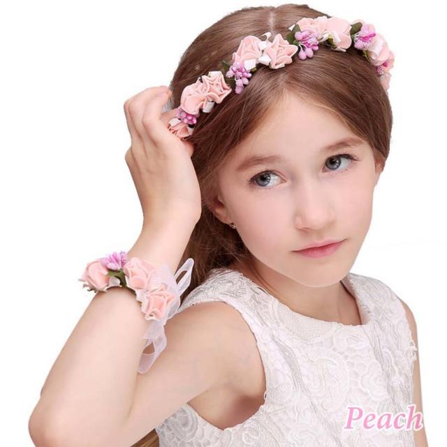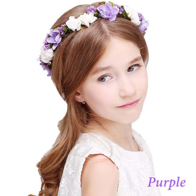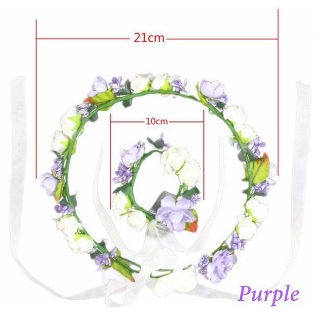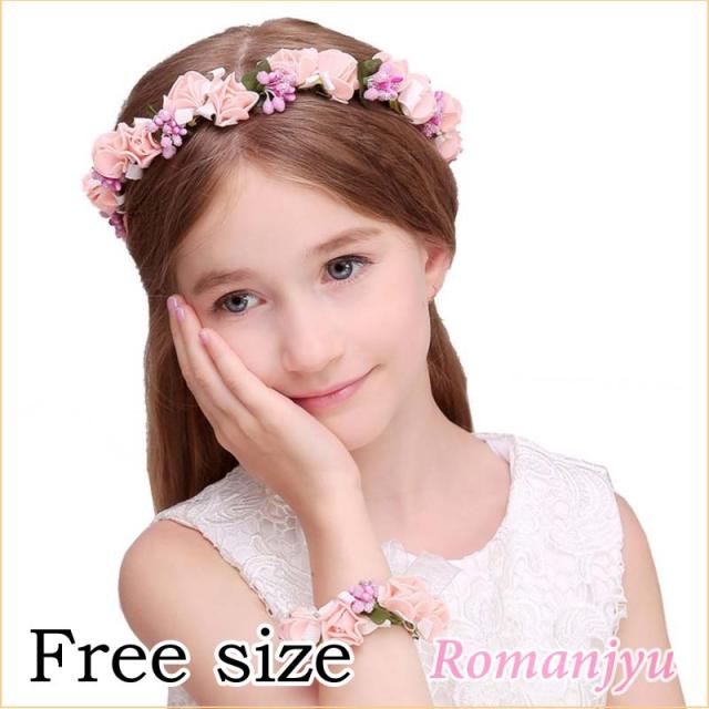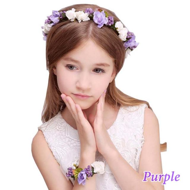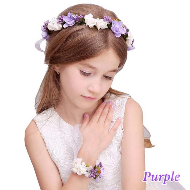 メール便発送 お買い得2点セット キッズ 花冠+リストレット パープル ピンク ヘッドドレス 子供 花かんむり ベールガール リボン 女の子 花かんむり フラワーティアラ