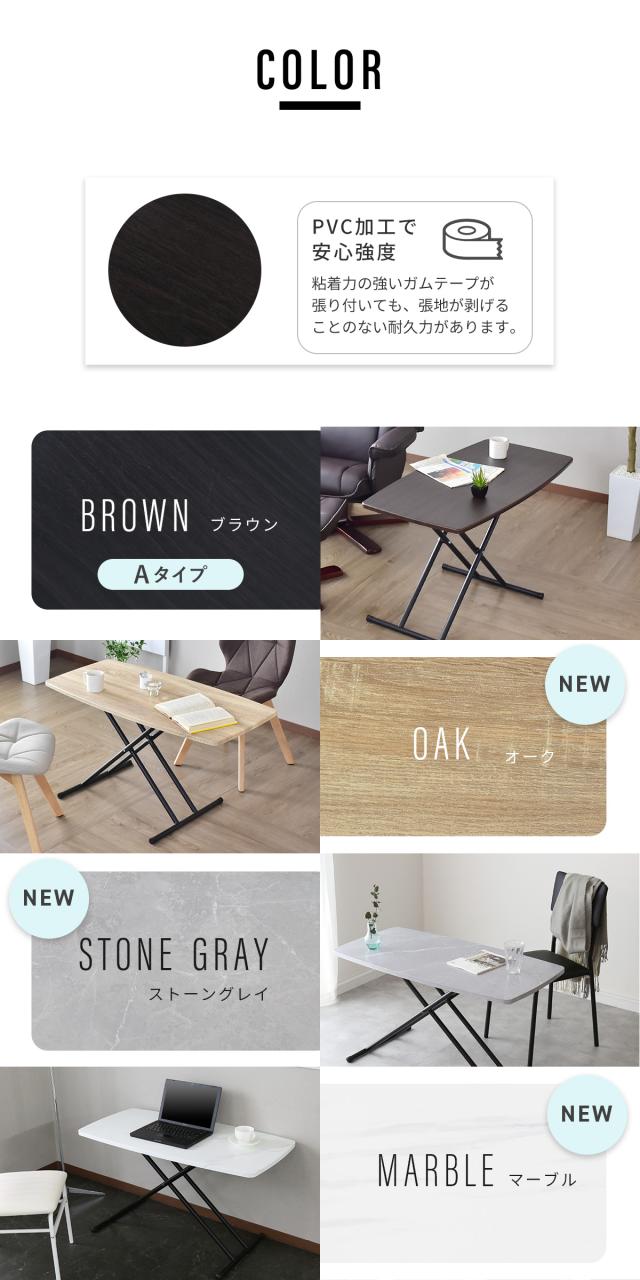 この昇降テーブルは、5段階の高さ調節が可能。座椅子と組み合わせてローテーブルとして使うのも良し、ダイニングテーブルの高さで食事を楽しむのも良し、デスクとして作業をするのも良しと、シチュエーションに合わせて自由に変更できます。高さ調節は簡単なレバー操作で行えるため、力の弱い方でもスムーズに調整可能。高さを固定すればしっかり安定し、快適に使用できます。リビング、オフィス、ショップなど、さまざまな場面で活躍する多機能テーブルです。