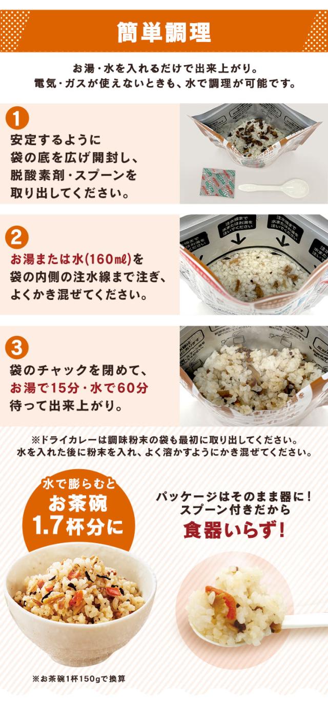 お湯を注ぐとふっくらおいしい、「アルファ化米・五目御飯」
