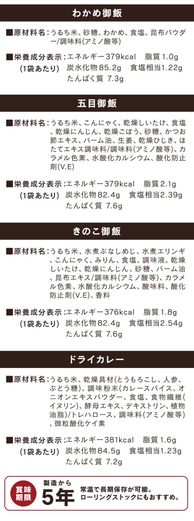 うるち米(国産)、こんにゃく、乾燥しいたけ、食塩、乾燥にんじん、乾燥ごぼう、砂糖、かつお節エキス、パーム油、生姜、乾燥ひじき、ほたてエキス調味料/調味料(アミノ酸等)、カラメル色素、水酸化カルシウム、酸化防止剤(V.E)