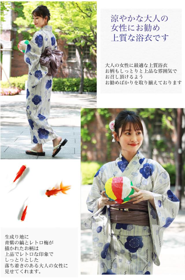 浴衣 単品 レトロ 高級変わり織り綿麻浴衣単品「生成り地に青紫の縞とレトロ梅」浴衣 生成り 梅 レディース 古典柄 大人 モダン しっとり 2021