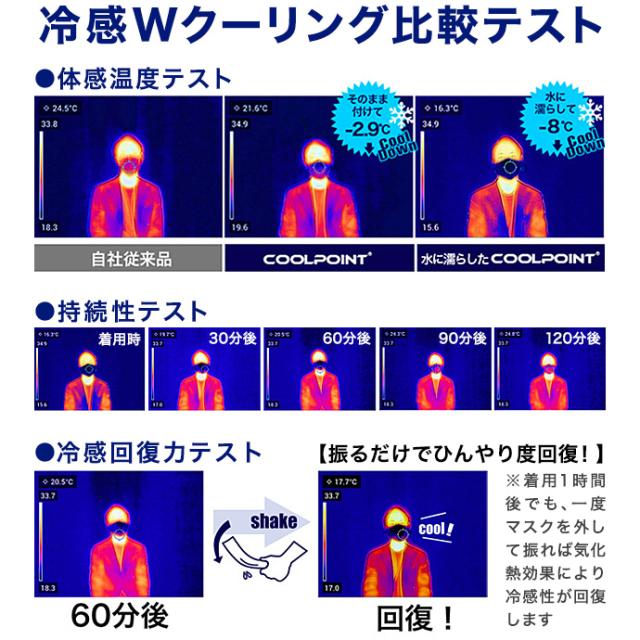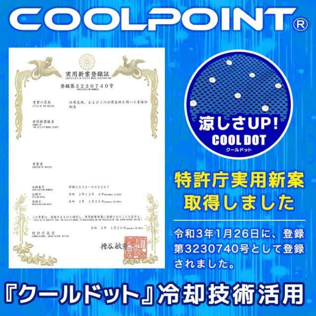 熱伝導率に優れたアルミニウム製の『クールドット』が肌に触れることでヒンヤリ感を与え、さらに本体の冷感メッシュ地は水に濡らすことで気化熱効果を発揮します。これらダブルの効果でより高いクーリング効果が得られます。