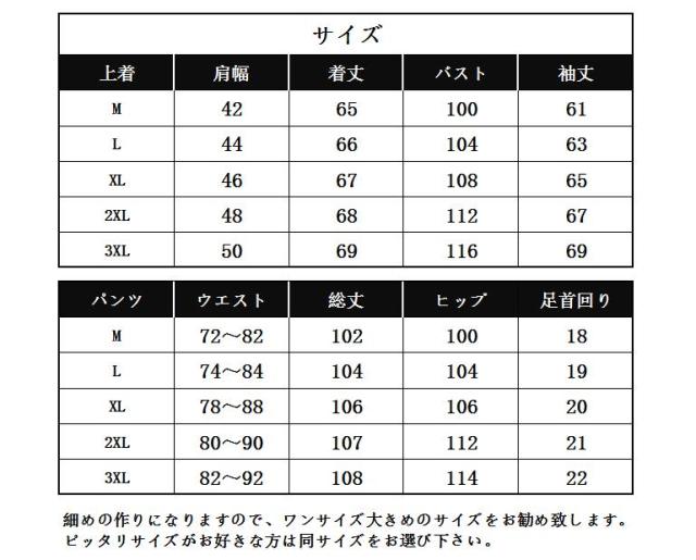 - 速やかな対応ありがとうございました デザインが、好きで購入させていただきました。 欲を言えば、ズボンの裾も上着の袖のようなゴム仕様バージョンもあると多少長くても着こなせると思いました