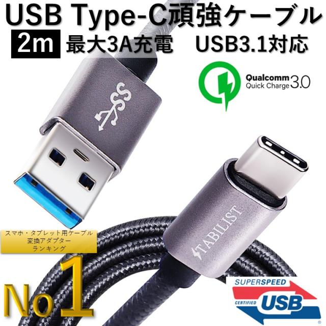 家電雑誌掲載品 USB-Type-C 充電ケーブル 2m 3A 急速充電 USB3.0 変換 タイプc typec USB-C usbc USB-A android Xperia Galaxy iPad Pro MacBook switch iqos シルバーグレー 送料無料