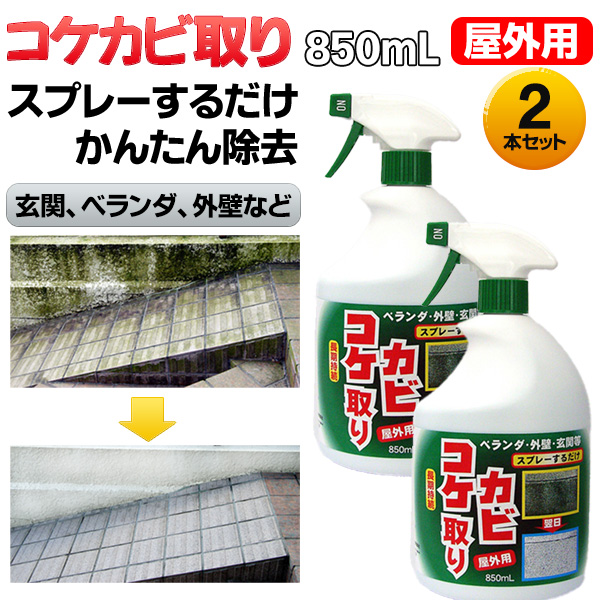コケカビ取り(屋外用) 850mlはスプレーするだけの屋外用カビとり剤です。外壁、ベランダ、門柱、玄関、タイル、レンガ、踏み石、墓石など、建造物についた青ゴケやカビ、地衣植物、黒ずみを除去します。スプレーするだけで、水洗いは不要です。こすらないから、建造物表面を損傷せずに除去できます。1本で約8〜16平方メートルに散布出来ます。