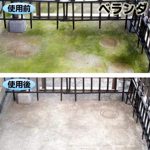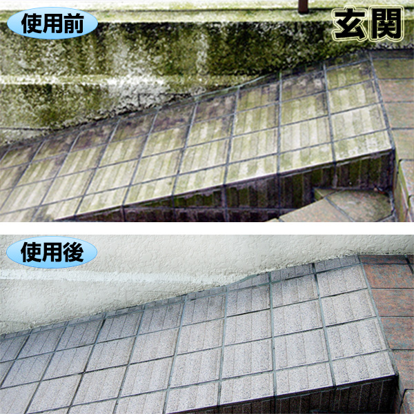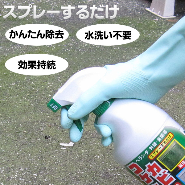 コケカビ取り(屋外用) 850mlはスプレーするだけの屋外用カビとり剤です。外壁、ベランダ、門柱、玄関、タイル、レンガ、踏み石、墓石など、建造物についた青ゴケやカビ、地衣植物、黒ずみを除去します。スプレーするだけで、水洗いは不要です。こすらないから、建造物表面を損傷せずに除去できます。1本で約8〜16平方メートルに散布出来ます。