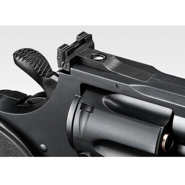 1発ごとに手動で発射準備を行なう、手軽なエアーコッキングモデルです。ハンマーを操作するだけで発射準備完了となり、あとはトリガーを引くだけでBB弾を発射します。■リボルバーの操作を再現:BB弾をセットしたカートリッジを、1発ずつシリンダーにセット。>リボルバーならではのリロードが楽しめます。■ホップアップシステム:弾に回転をあたえることで、少ないパワーで遠くまでBB弾を飛ばすことができるホップアップシステムを搭載しています。■セフティ搭載:トリガー根元にあるセフティをかけるとトリガーが引けなくなり、ハンマーもロックして誤射を防止します。■アジャスタブル・リアサイト:リアサイトはドライバーで左右上下に調整可能です。■カートリッジ6個が付属:BB弾を1発ずつ装填できるカートリッジが6発分付属します。■ホップアップシステム 搭載■シングルアクション発射(単発)のみ