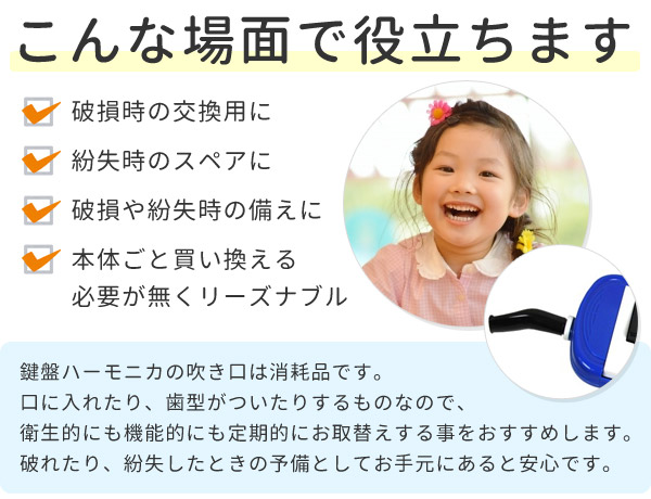 鍵盤ハーモニカの吹き口は消耗品です。口に入れたり、歯型がついたりするものなので、衛生的にも機能的にも定期的にお取替えする事をおすすめします。