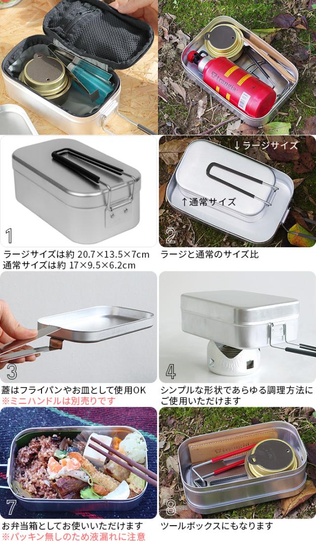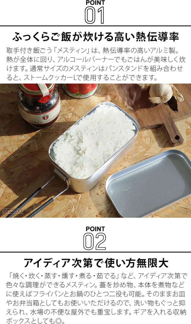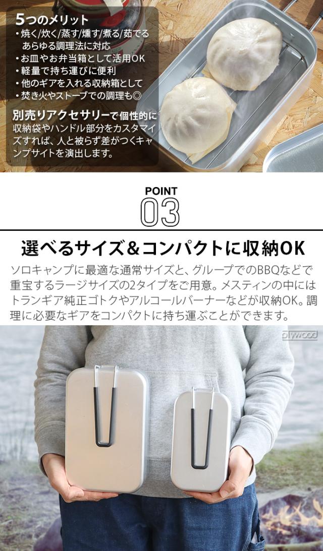 取手付き飯ごう「メスティン」は、熱伝導率の高いアルミ製。熱が全体に回り、アルコールバーナーでもごはんがふっくら美味しく炊けます。「焼く・炊く・蒸す・燻す・煮る・茹でる」など、あらゆるBBQ調理に対応!アイディア次第で使い方も無限大です。蓋で炒めもの本体を煮炊きに使えば、フライパンとお鍋のひとつ二役としても使用可能。そのままお皿やお弁当箱としてお使いいただければ洗い物もぐっと抑えられ、水場の不便な屋外でも重宝します。ツールやギアを入れる収納ボックスとしても◎。みんなが使うメスティンだから、別売りアクセサリーで個性的に収納袋やハンドル部分をカスタマイズすれば、人と被らず差がつくキャンプサイトを演出してくれる点も魅力です。軽量でコンパクトなメスティンはソロキャンプやもちろん、仲間とのBBQにも最適です。