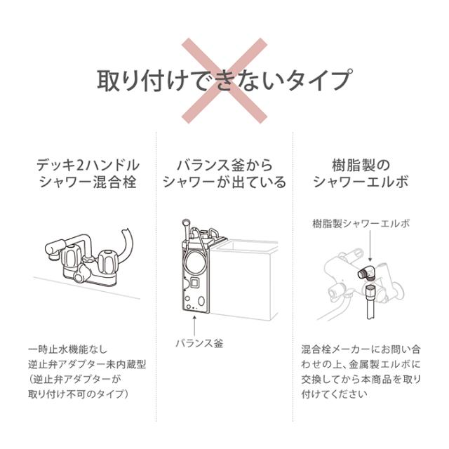 ・逆止弁のついていない混合栓にそのまま取り付けないでください。