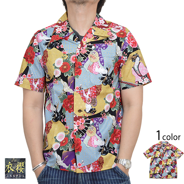 ゴールドラメコットン半袖アロハシャツ「浮世絵芸者」 衣櫻 SA-1388 和柄 和風 日本製 国産[mij_m][mij]