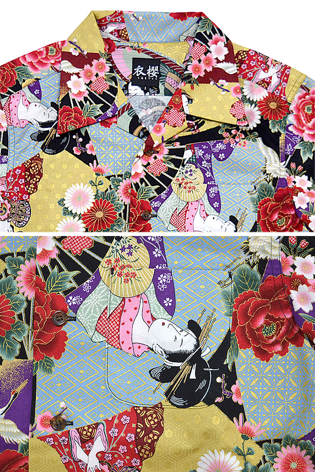 味わい深い物作りをされている衣櫻さんから、ゴールドラメコットン半袖アロハシャツ「浮世絵芸者」(SA-1388)のご紹介です。