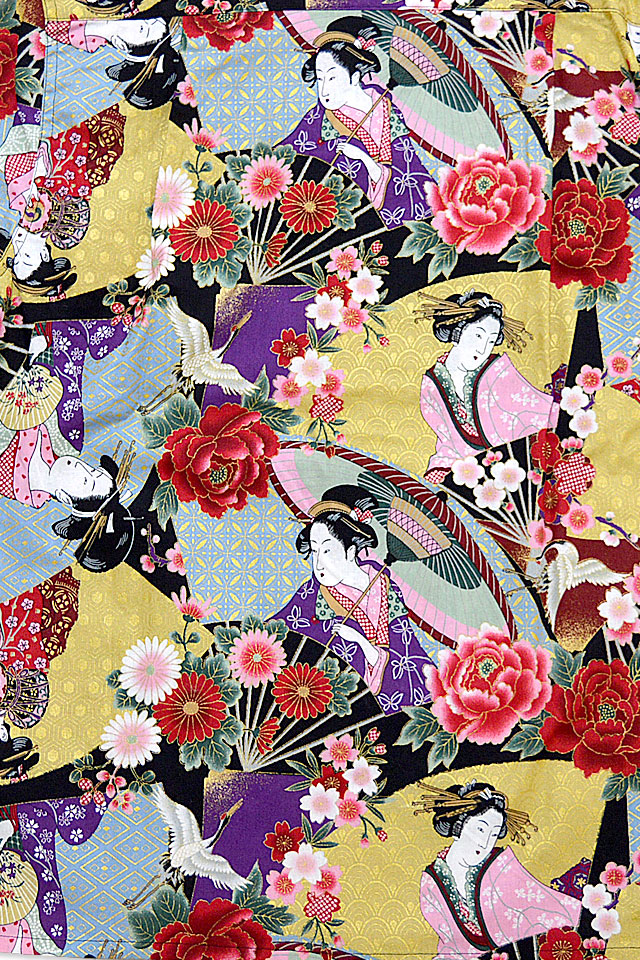 芸者や青波波、牡丹などの和模様を贅沢に組み合わせたデザインです。
