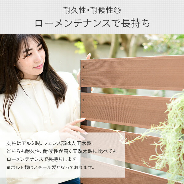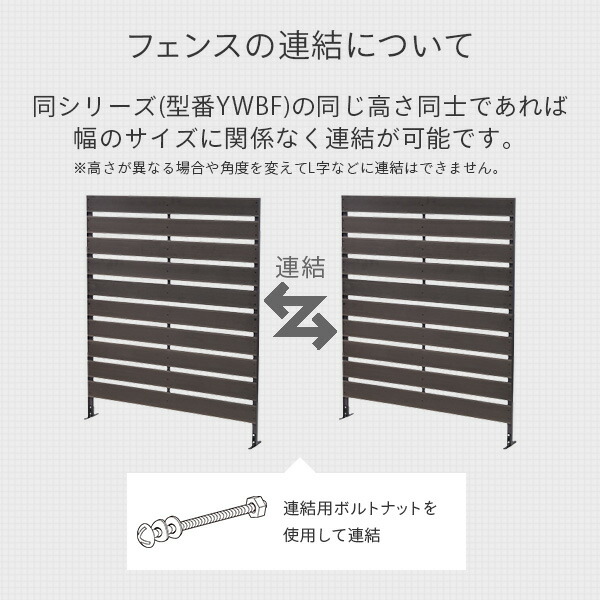 | 商品説明 | ●耐久性、耐候性と自然な風合いのバランスが取れた人工木製ガーデンフェンス ●幅120cm、高さ150cmタイプ ●フェンスデザイン:ボーダー ●人工木材のカラーは2色(ブラウン、ナチュラル)よりお選びください ●天然木製に比べて耐久性が高く、また給水率が低いので雨や水に強い人工木製 ●天然木のような自然な木の質感にこだわりました ●お隣、ご近所との間仕切りや目隠しにも使えます ●簡単にDIYで組立、設置ができるフルセット ●セット内容:フェンス本体、L字プレート×4、L字ペグ×2、ネイルペグ×4、ボルトナット×必要数(予備1)、連結用ボルトナット×1、スパナ ※各固定環境により別途、工具類が必要になります ブロック固定時:モルタル等 コンクリート固定時:ドリルドライバー、コンクリート用ビス(4×25mm)×8 等 ●フェンスの連結について ・同シリーズ(型番YWBF)の同じ高さ同士であれば幅のサイズに関係なく連結が可能です ※高さが異なる場合は連結ができません ※角度を変えてL字などに連結はできません ・人工木プランターフェンス(型番YPF)とは同じ高さであっても連結はできません ※ただし、各フェンスの高さは揃えて設置することが可能です ●フェンス部のサイズ:(1枚あたり)高さ11.5cm、(フェンスの間隔)2.3cm ※天然木材同様に若干の反りがある場合がございますが、フェンス設置上は問題ございません ※人工木の特性上、小さなひっかき傷や欠けが生じることもございます ※製造工程の都合上、ロットにより若干の色のバラつきがございます ※ご使用のパソコンやスマホの画面によっては見える色味が若干違う可能性がございます あらかじめご了承ください ※支柱設置不備による事故等は、一切責任を負いかねます |