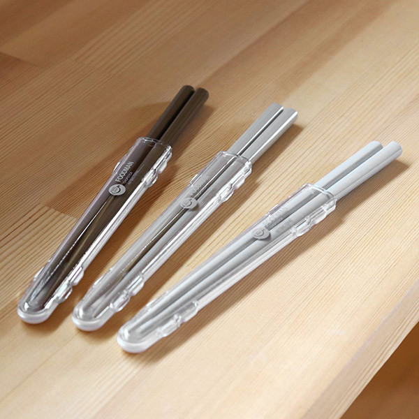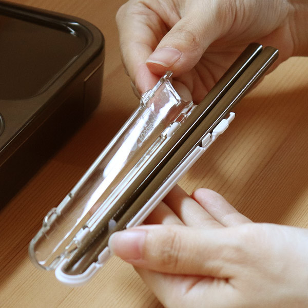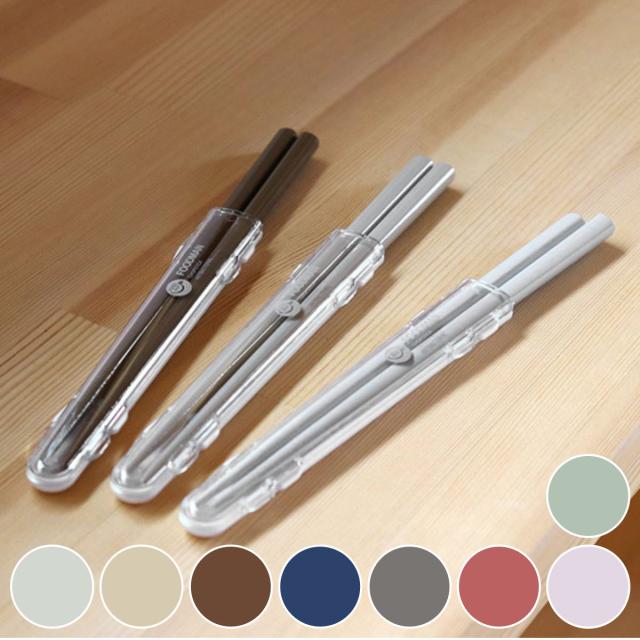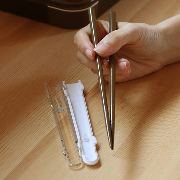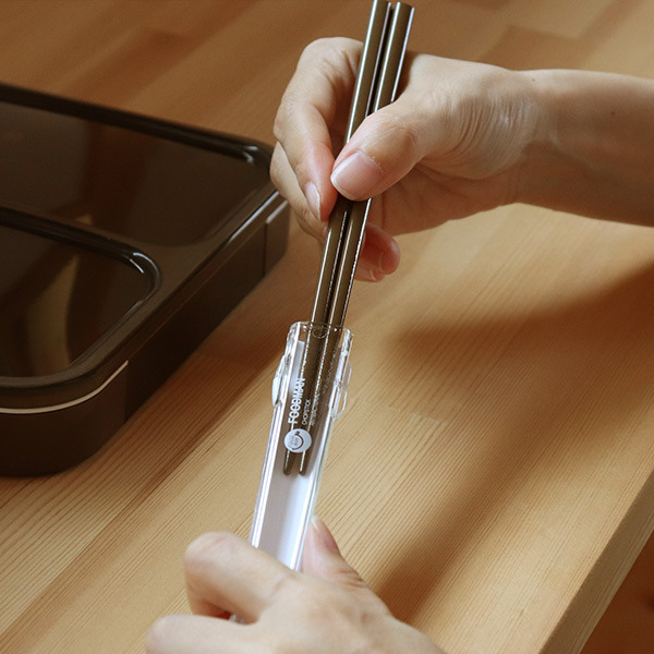お箸を差し込むだけで簡単に収納できます。ストッパー付きでカチャカチャ音が鳴りにくいので、気兼ねなくビジネスバッグに入れられます。