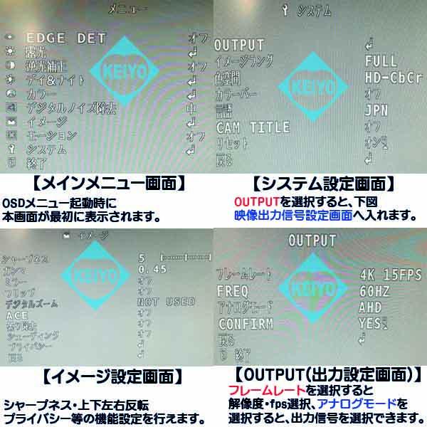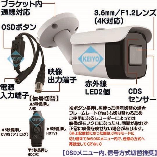 (※AHD映像出力は、対応機器にのみ入力できます) 800万画素対応録画機と組み合わせることで、3840×2160サイズの 録画をすることが可能になります。 OSDボタンで、CVBS(アナログ)出力の切替にも対応しています。