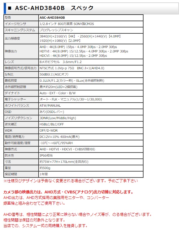 ■ 800万画素AHDバレット型カメラ ASC-AHD3840B