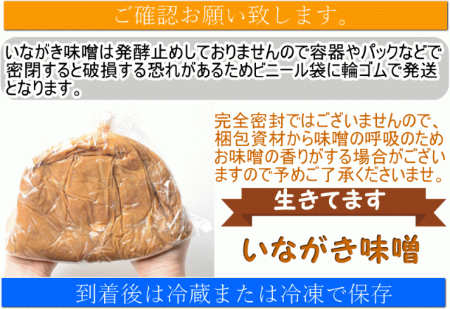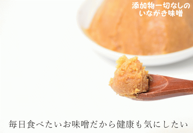 | 添加物一切なし 津軽いながき味噌 芳醇な香りと豊かな風味のいながき味噌。 こちらの味噌は添加物を一切使用せず発酵止めもしていない昔ながらの天然醸造です。(熱処理を行っていない自然発酵で日本の移りゆく四季をお味噌が感じながら、ゆっくりと熟成) こちらのお味噌は調味料なども使用しておりませんので出汁(だし)が入っておりません。(お味噌汁にご利用の場合はお好みのだしをご利用ください) 青森県産の米と大豆 おおすず(遺伝子組み換えでない)を100%使用した「津軽いながき味噌」昔ながらの田舎の味、米糀の甘みが生きたまろやかな味わいをぜひお楽しみください。 ご確認お願いいたします お届けの状態は完全に密封をしておりません。(発酵止めをしていないため常温ですと膨張します) その為、味噌が呼吸し梱包資材から味噌の香りがする場合がございます。 予めご了承くださいませ。 また商品ご到着後はなるべく空気に触れないように必ず冷蔵、または冷凍で保存してください。 お味噌の過発酵や変色を抑えることができます。 また開封後はお早めにご使用くださいませ。 |