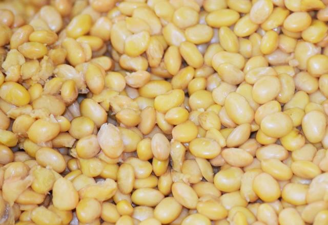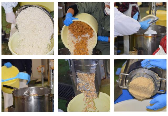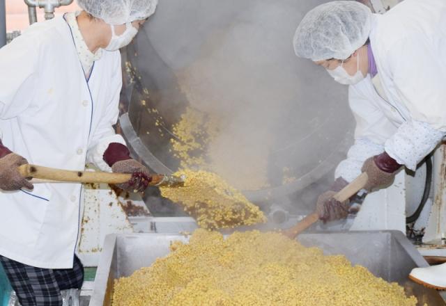 | 青森県産大豆 100% を蒸し少し冷めてから作業開始 |