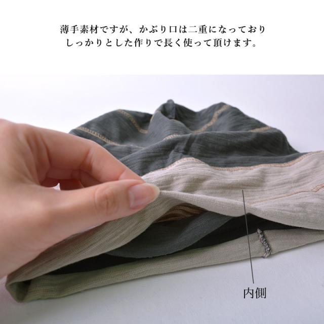 薄手素材ですが、かぶり口は二重になっておりしっかりとした作りになっていて長く使って頂けるアイテム。