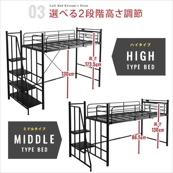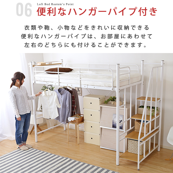 Rostem ロステム 階段付パイプロフトベッド (ロフト ベッド 収納付き階段 手すり パイプ 高さ調節 ハイタイプ ミドルタイプ 2口コンセント 宮棚 メッシュ床 通気性 頑丈 耐久性 ハンガーパイプ おしゃれ おすすめ)